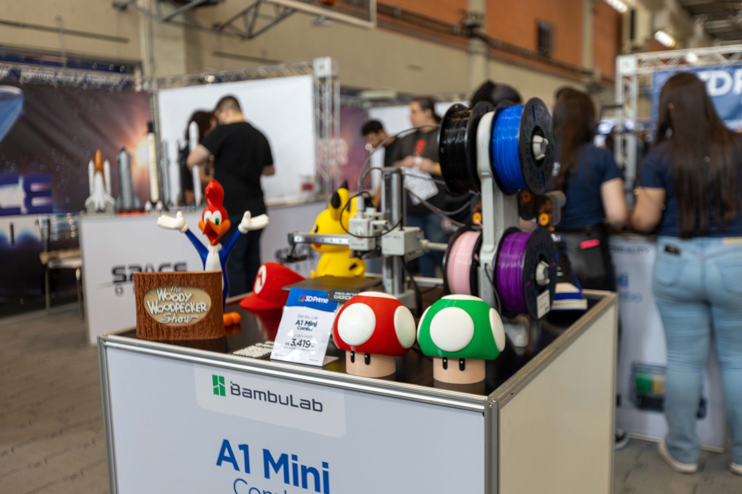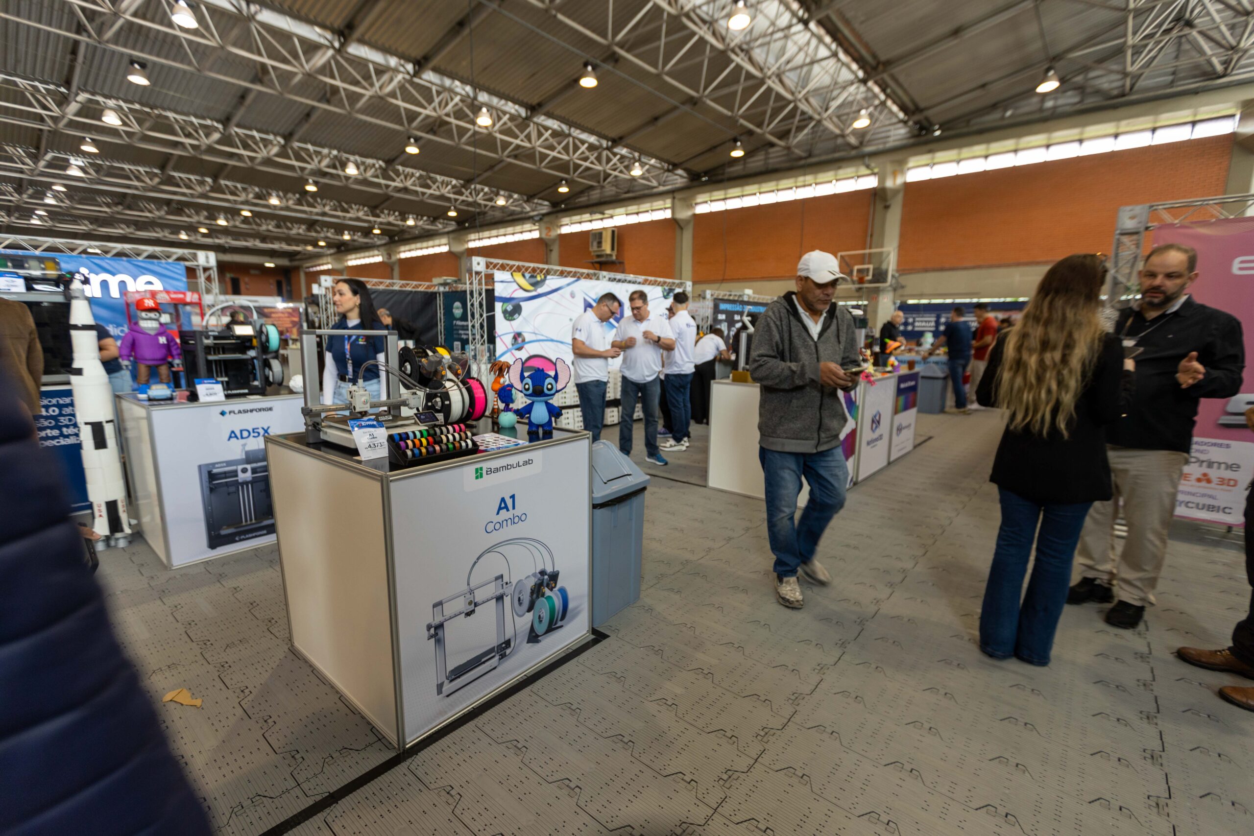 Hoje, o cenário é dominado por soluções plug and play. Estandes como o da Bambu Lab são a prova viva: máquinas que se autocalibram, trocam de filamento sozinhas e entregam peças multicoloridas com uma complexidade impensável na era “DIY” (Faça Você Mesmo). Essa facilidade de uso, antes restrita a equipamentos industriais caríssimos, democratizou o acesso à prototipagem rápida e impulsionou a adoção em massa, de pequenas empresas a gigantes da indústria.