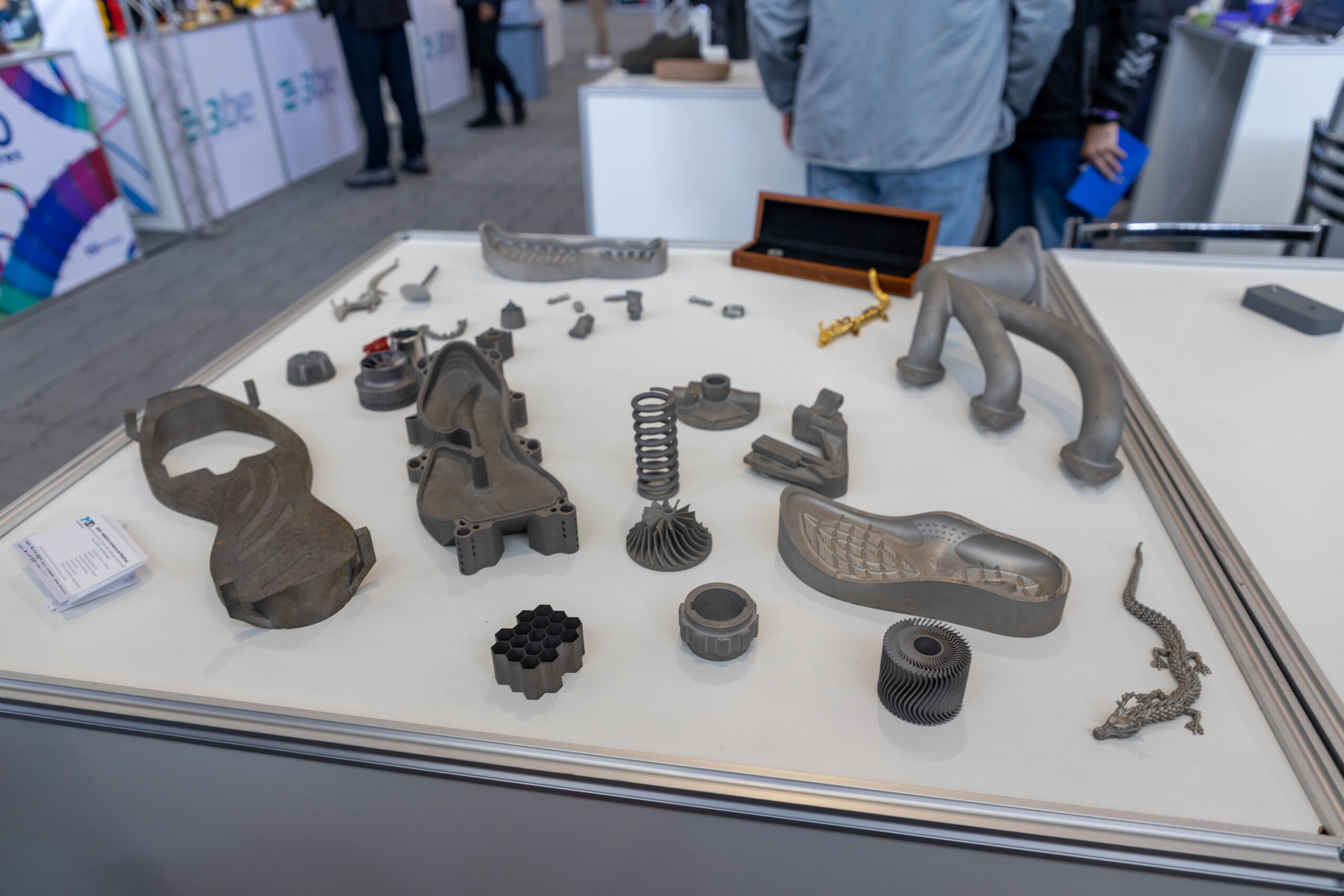 Em um dos estandes mais visitados, as peças expostas exigem certo esforço para serem manuseadas. São componentes robustos, pesados e frios ao toque. A impressão 3D em metal, que deposita pó metálico e o funde com laser, está rapidamente se tornando vital para a indústria nacional. Vemos engrenagens complexas, componentes de motores e ferramentas que seriam impossivelmente caras ou demoradas de se produzir por usinagem tradicional. É a manufatura aditiva entrando na produção de peças finais, não apenas protótipos.