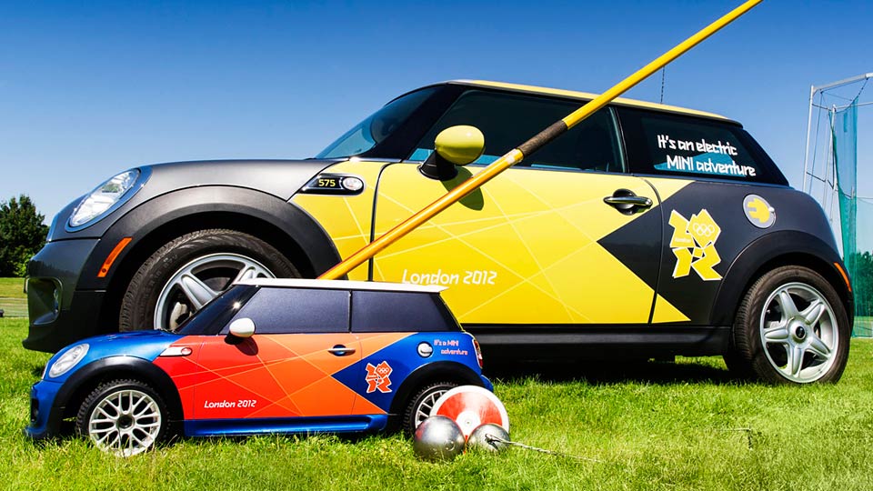 Pensando em agilizar os processos de avaliação em algumas provas durante os Jogos Olímpicos de Londres, como arremesso de dardos, martelos e discos, por exemplo, em um projeto publicitário em parceria com a BMW, reunindo 160 modelos do Active Es e 40 Mini Coopers, foram fornecidas algumas unidades de carrinhos rádio controlados e caracterizados a partir dos modelos Mini, sendo comum ver os brinquedos pelos estádios. Os carrinhos suportam o trasporte de até 18 Kg e são alimentados por baterias com autonomia de 35 minutos. O controle dos carrinhos é realizado pelo supervisor, tranquilamente acomodado com alguns metros de distância do local onde está ocorrendo a prova, enquanto se necessário, um assistente vai até o devido local da pista para auxiliar.